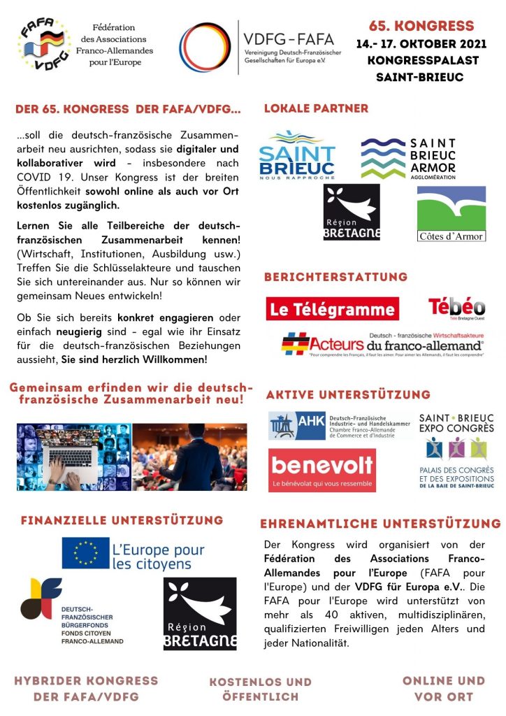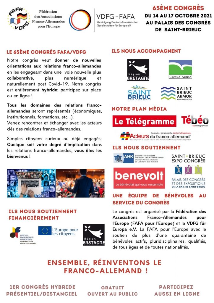 Du 14 au 17 octobre 2021 à Saint-Brieuc, en présentiel mais également en distanciel, nous «réinventerons le franco-allemand».